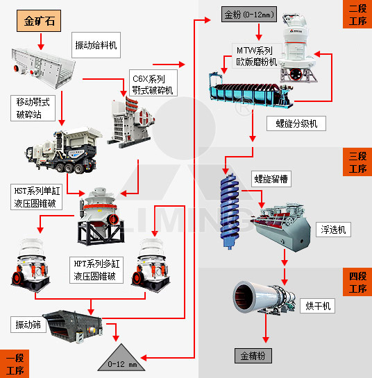 大塊的金礦石經料倉由振動給料機均勻地送進顎式破碎機或粗碎移動站進行粗碎;粗碎后的金礦石經過振動篩篩分后,由皮帶輸送機送到單缸液壓圓錐式破碎機進行中碎;中碎后的金礦石物料送入多缸液壓圓錐式破碎機進行細碎;