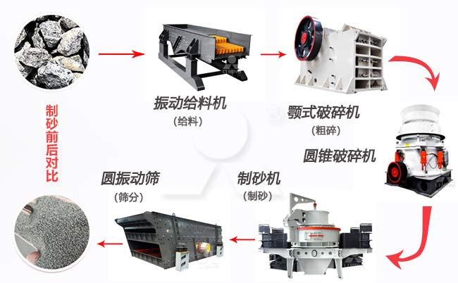 尺寸較大(≤500mm)的大塊石頭先進(jìn)入到顎式破碎機(jī)內(nèi)進(jìn)行初步粗碎加工;再由皮帶輸送機(jī)將破碎成品送入到單缸圓錐破碎機(jī)內(nèi)進(jìn)一步的中細(xì)碎;細(xì)碎后的石料再由膠帶輸送機(jī)送到制砂機(jī)中進(jìn)行整形制砂,制砂的成品由膠帶輸送機(jī)送到振動篩進(jìn)行篩分,篩分出不同規(guī)格粒度的沙子。