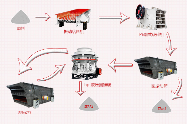 道砟破碎工藝流程:原料→振動(dòng)給料機(jī)→顎式破碎機(jī)→圓錐破碎機(jī)→振動(dòng)篩→皮帶輸送機(jī)→道砟石成品料;